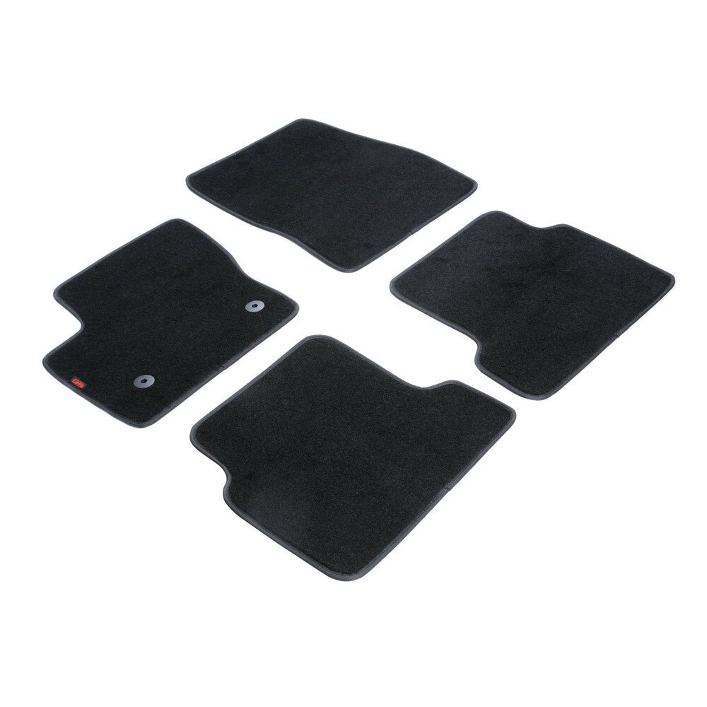 Πατάκια αυτοκινήτου από την εταιρία LAMPA, ιταλικής προέλευσης, κατασκευασμένα από υψηλής ποιότητας μοκέτα - 100% πολυπροπυλένιο - σε μαύρο χρώμα με περιμετρικό φινίρισμα από βελούρ ρέλι (απομίμηση βελούδου), σχεδιασμένα για να ταιριάζουν ακριβώς στις διαστάσεις του δαπέδου του εκάστοτε οχήματος - μαρκέ προϊόν. Είναι αδιάβροχα και διαθέτουν αντιολισθητικό πάτο ενισχυμένο με gel στο πίσω μέρος τους για καλύτερη πρόσφυση στο δάπεδο, καθώς και κουμπιά στερέωσης fix-points για όσα οχήματα είναι εξοπλισμένα με αντίστοιχες εργοστασιακές υποδοχές για να παραμένουν σταθερά στο πάτωμα της καμπίνας κατά την είσοδο/έξοδο των επιβατών.