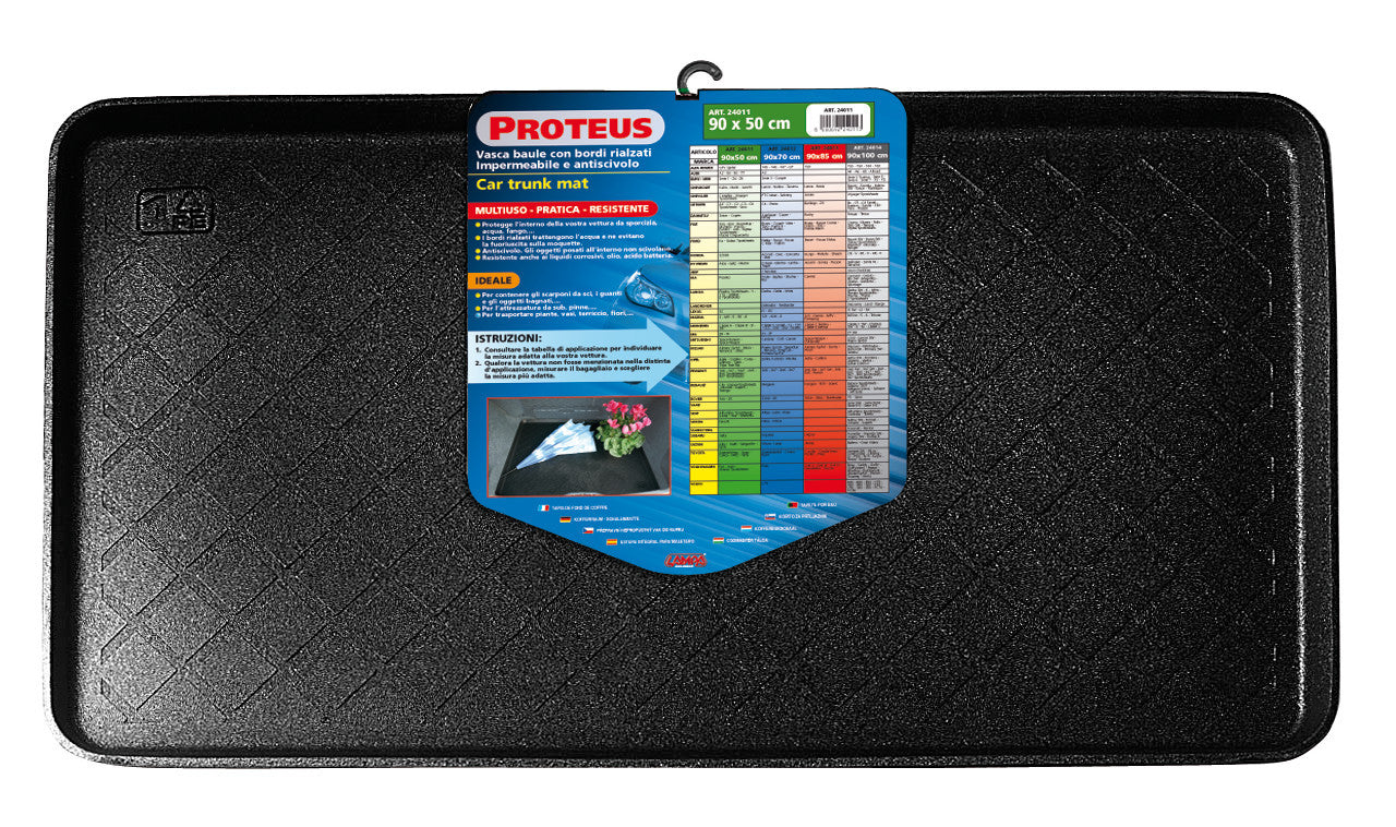 Πατάκι σκάφη πορτ μπαγκάζ της σειράς SU MISURA TRUNK MAT από την εταιρία LAMPA, ιταλικής προέλευσης, κατασκευασμένο από υψηλής ποιότητας άοσμο, ανακυκλώσιμο, οικολογικό, φιλικό προς το περιβάλλον, μη τοξικό, αντιχαρακτικό συνθετικό ελαστικό υλικό σε μαύρο χρώμα. Ιδανικό αξεσουάρ αυτοκινήτου για να προσφέρει προστασία στον χώρο αποσκευών, εξοπλισμένο με αντιολισθητικό πάτο για να παραμένει σταθερό στη θέση του και ειδικά κουμπώματα για να μπορεί να προστεθεί πατάκι επέκτασης για προστασία του προφυλακτήρα ή των πίσω καθισμάτων όταν αυτά είναι πεσμένα (δεν περιλαμβάνεται - πωλείται ξεχωριστά). Η σκάφη είναι σχεδιασμένη με ανάγλυφο μοτίβο και διαθέτει ανασηκωμένες άκρες, που διατηρούν στο εσωτερικό όλη τη βρωμιά, τη σκόνη, τις λάσπες και την υγρασία, χωρίς να υπάρχουν διαρροές ή να μεταφέρονται υπολείμματα στις υπόλοιπες επιφάνειες του πορτ μπαγκάζ κατά τη μεταφορά και χρήση. Ένα πρακτικό και πολύ ελαφρύ προϊόν, για να μπορεί να καθαριστεί ή να τιναχτεί με μεγάλη ευκολία, πλήρως αδιάβροχο και κατάλληλο για χρήση κατά τη διάρκεια όλων των εποχών, διατηρώντας το αρχικό του σχήμα αμετάβλητο. Ειδικά διαμορφωμένο στις μετρήσεις του εκάστοτε οχήματος για να ταιριάζει πλήρως στον χώρο αποσκευών του αυτοκινήτου (μαρκέ). Εύκολη και γρήγορη τοποθέτηση.